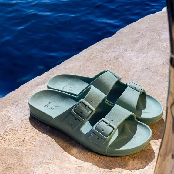Crafted in Brazil from 100% recyclable PVC, they combine comfort, durability, and effortless style. Their matte finish and vintage green hue bring a subtle touch of freshness to any outfit — from beach days to city strolls.